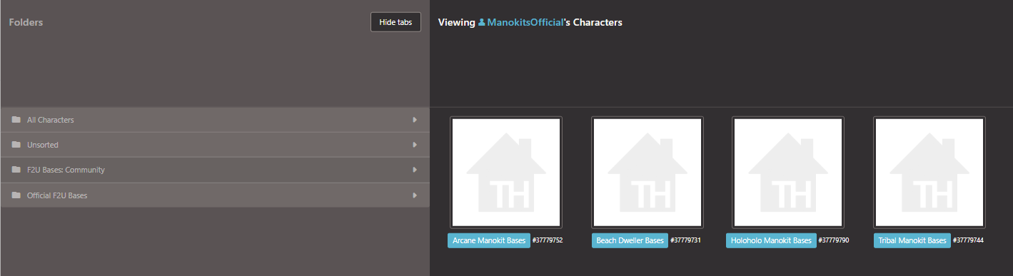 Click "Select from Other User's Characters" and type "ManokitsOfficial" which will bring you to the profile, and you can just select one from the desired folder.